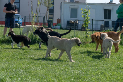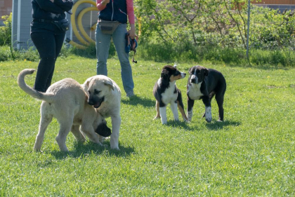 In dieser Stunde kann Ihr Hundekind Erfahrungen mit anderen Welpen machen, damit sein Sozialverhalten gut entwickelt und gefestigt wird. Dazu werden die Hunde beim Freispiel nach Größen in Kleingruppen eingeteilt, um zu verhindern, dass kleine Hunde von größeren umgerannt werden und dadurch schlechte Erfahrungen mit anderen Welpen machen. Um dennoch den Umgang mit großen (und auch erwachsenen Hunden) zu erlernen, nimmt auch ab und zu ein gut sozialisierter erwachsener Hund am Freispiel teil. Auch lernt Ihr Vierbeiner hier bereits erste Grundkommandos. Des Weiteren zeigen wir Ihnen viele Ideen und Möglichkeiten zur Beschäftigung Ihres Hundes, damit Ihr Welpe eine gute Bindung und Beziehung zu Ihnen aufbauen kann. Bei ersten gemeinsamen Außentrainings werden Alltagssituationen (z.B. beim Gassi gehen) geübt.