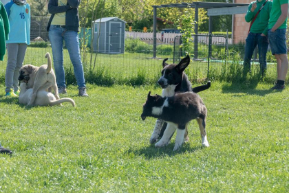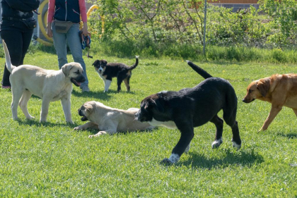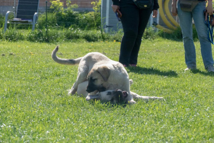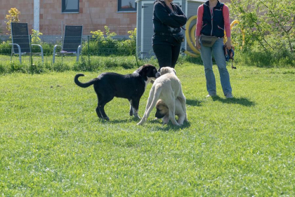 In dieser Stunde kann Ihr Hundekind Erfahrungen mit anderen Welpen machen, damit sein Sozialverhalten gut entwickelt und gefestigt wird. Dazu werden die Hunde beim Freispiel nach Größen in Kleingruppen eingeteilt, um zu verhindern, dass kleine Hunde von größeren umgerannt werden und dadurch schlechte Erfahrungen mit anderen Welpen machen. Um dennoch den Umgang mit großen (und auch erwachsenen Hunden) zu erlernen, nimmt auch ab und zu ein gut sozialisierter erwachsener Hund am Freispiel teil. Auch lernt Ihr Vierbeiner hier bereits erste Grundkommandos. Des Weiteren zeigen wir Ihnen viele Ideen und Möglichkeiten zur Beschäftigung Ihres Hundes, damit Ihr Welpe eine gute Bindung und Beziehung zu Ihnen aufbauen kann. Bei ersten gemeinsamen Außentrainings werden Alltagssituationen (z.B. beim Gassi gehen) geübt.